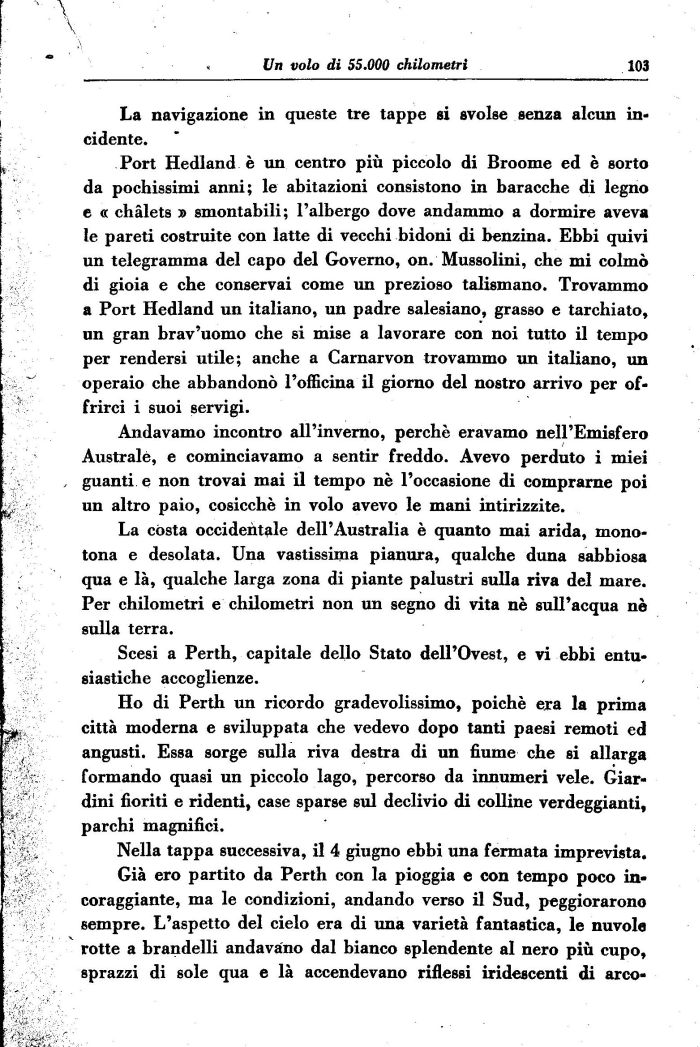 Port Hedland è un centro più piccolo di Broome ed è sorto da pochissimi anni; le abitazioni consistono in baracche di legno e « chàlets » smontabili; l'albergo dove andammo a dormire aveva le pareti costruite con latte di vecchi bidoni di benzina. Ebbi quivi un telegramma del capo del Governo, on. Mussolini, che mi colmò di gioia e che conservai come un prezioso talismano. Trovammo a Port Hedland un italiano, un padre salesiano, grasso e tarchiato, un gran brav'uomo che si mise a lavorare con noi tutto il tempo per rendersi utile; anche a Carnarvon trovammo un italiano, un operaio che abbandonò l'officina il giorno del nostro arrivo per offrirci i suoi servigi.