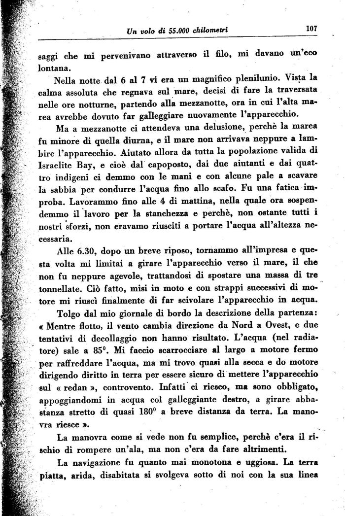 Alle 6.30, dopo un breve riposo, tornammo all'impresa e questa volta mi limitai a girare l'apparecchio verso il mare, il che non fu neppure agevole, trattandosi di spostare una massa di tre tonnellate. Ciò fatto, misi in moto e con strappi successivi di motore mi riuscì finalmente di far scivolare l'apparecchio in acqua.