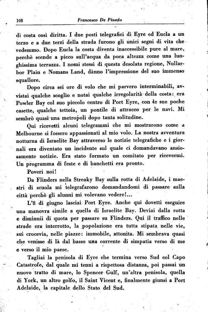 Qui ricevetti alcuni telegrammi che mi mostrarono come a Melbourne si fossero appassionati al mio volo. La nostra avventura notturna di Israelite Bay attraverso le notizie telegrafiche e i giornali era diventato un incidente sul quale ci domandavano ansiosamente notizie. Era stato formato un comitato per ricevermi. Un programma di feste e di banchetti era pronto.