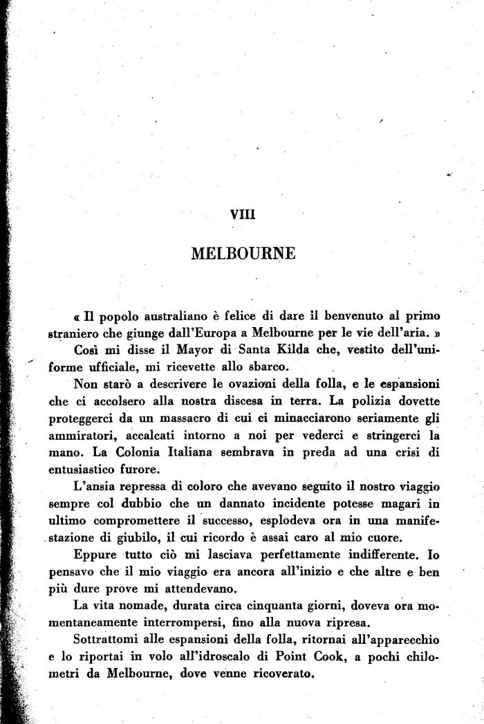 « Il popolo australiano è felice di dare il benvenuto al primo straniero che giunge dall'Europa a Melbourne per le vie dell'aria. »
