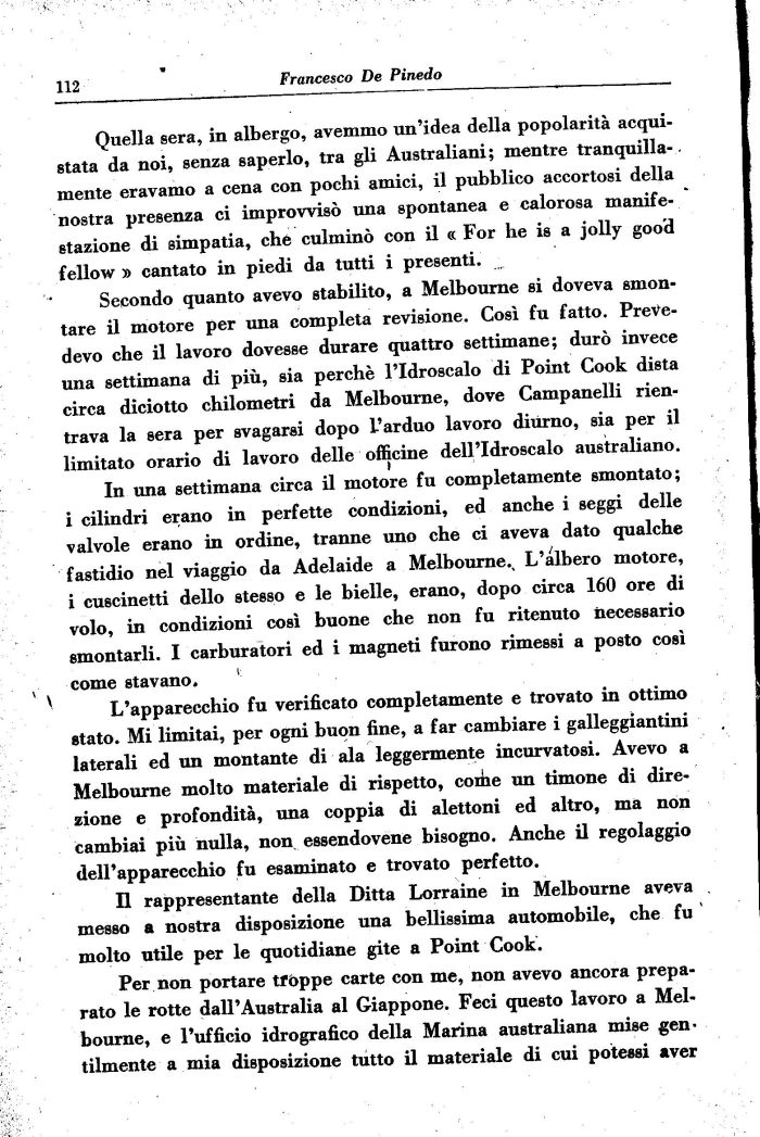 Secondo quanto avevo stabilito, a Melbourne si doveva smontare il motore per una completa revisione. Così fu fatto. Prevedevo che il lavoro dovesse durare quattro settimane; durò invece una settimana di più, sia perchè l'Idroscalo di Point Cook dista circa diciotto chilometri da Melbourne, dove Campanelli rientrava la sera per svagarsi dopo l'arduo lavoro diurno, sia per il limitato orario di lavoro delle officine dell'Idroscalo australiano.