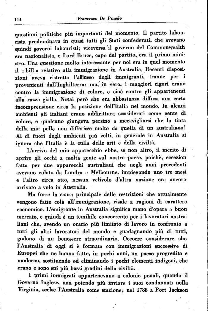 L'arrivo del mio apparecchio ebbe, se non altro, il merito di aprire gli occhi a molta gente sul nostro paese, poiché, eccezion fatta per due apparecchi australiani che negli anni precedenti avevano volato da Londra a Melbourne, impiegando uno tre mesi e l'altro circa otto, nessun velivolo d'altra nazione era ancora arrivato a volo in Australia.