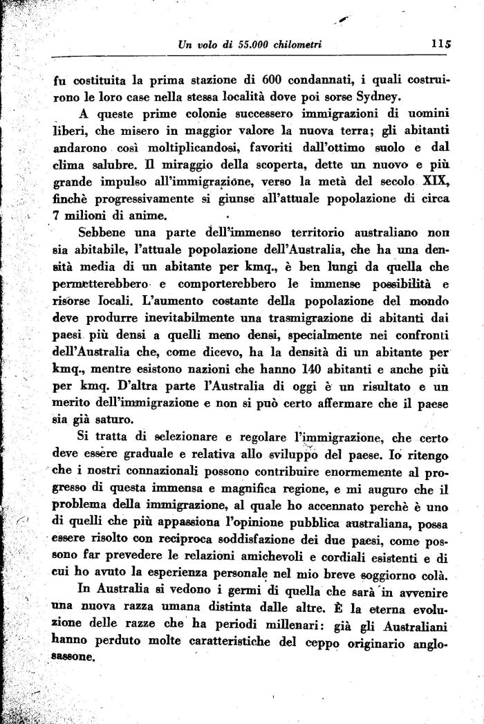 Sebbene una parte dell'immenso territorio australiano non sia abitabile, l'attuale popolazione dell'Australia, che ha una densità media di un abitante per kmq., è ben lungi da quella che permetterebbero e comporterebbero le immense possibilità e risórse locali. L'aumento costante della popolazione del mondo deve produrre inevitabilmente una trasmigrazione di abitanti dai paesi più densi a quelli meno densi, specialmente nei confronti dell'Australia che, come dicevo, ha la densità di un abitante per kmq., mentre esistono nazioni che hanno 140 abitanti e anche più per kmq. D'altra parte l'Australia di oggi è un risultato e un merito dell'immigrazione e non si può certo affermare che il paese sia già saturo.