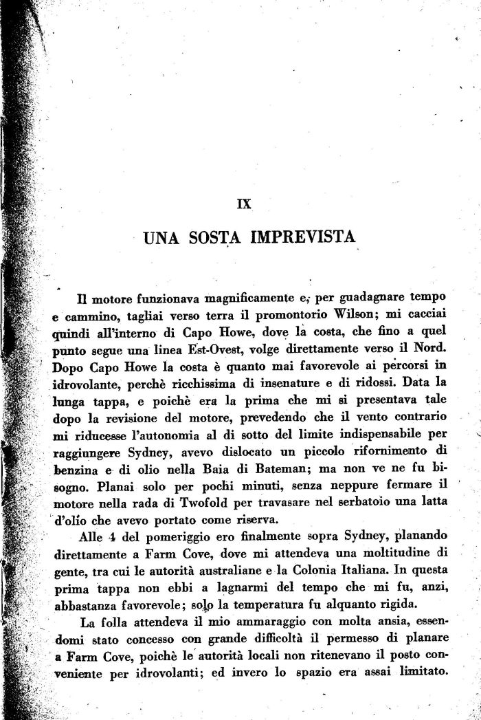 Alle 1 del pomeriggio ero finalmente sopra Sydney, planando direttamente a Farm Cove, dove mi attendeva una moltitudine di gente, tra cui le autorità australiane e la Colonia Italiana. In questa prima tappa non ebbi a lagnarmi del tempo che mi fu, anzi, abbastanza favorevole; so]p la temperatura fu alquanto rigida.
