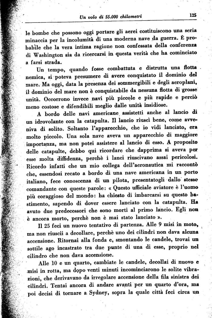 Il 25 feci un nuovo tentativo di partenza. Alle 9 misi in moto, ma non riuscii a decollare, perchè uno dei cilindri non dava alcuna accensione. Ritornai alla fonda e, smontando le candele, trovai un sottile ago incastrato tra due punte di una di esse, proprio nel cilindro che non dava accensione.