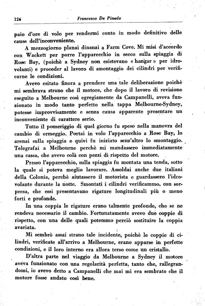 Avevo esitato finora a prendere una tale deliberazione poiché mi sembrava strano che il motore, che dopo il lavoro di revisione eseguito a Melbourne così egregiamente da Campanelli, aveva funzionato in modo tanto perfetto nella tappa Melbourne-Sydney, potesse improvvisamente e senza causa apparente presentare un inconveniente di carattere serio.