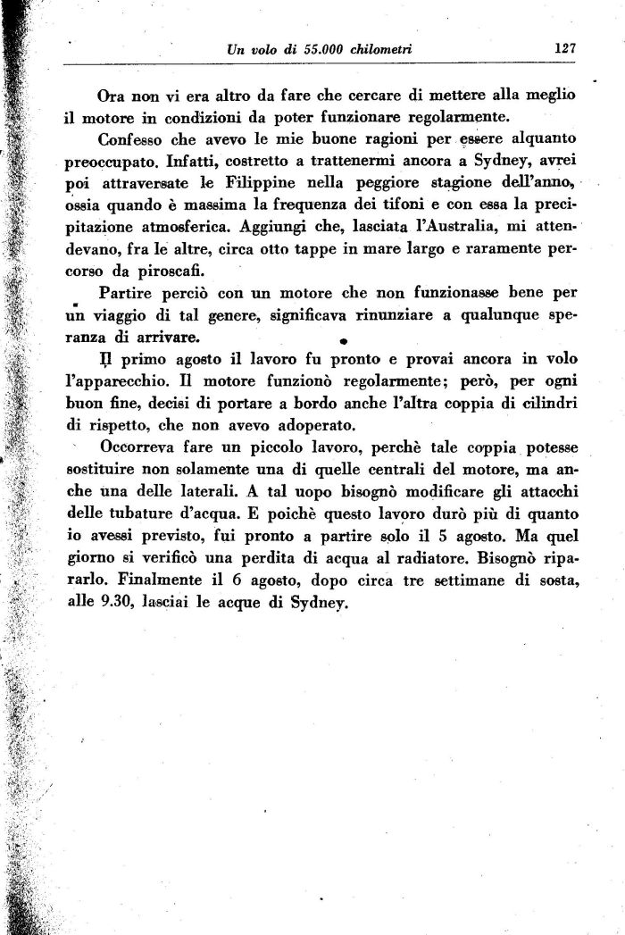 Occorreva fare un piccolo lavoro, perchè tale coppia potesse sostituire non solamente una di quelle centrali del motore, ma anche una delle laterali. A tal uopo bisognò modificare gli attacchi delle tubature d'acqua. E poiché questo lavoro durò più di quanto io avessi previsto, fui pronto a partire solo il 5 agosto. Ma quel giorno si verificò una perdita di acqua al radiatore. Bisognò ripararlo. Finalmente il 6 agosto, dopo circa tre settimane di sosta, alle 9.30, lasciai le acque di Sydney.