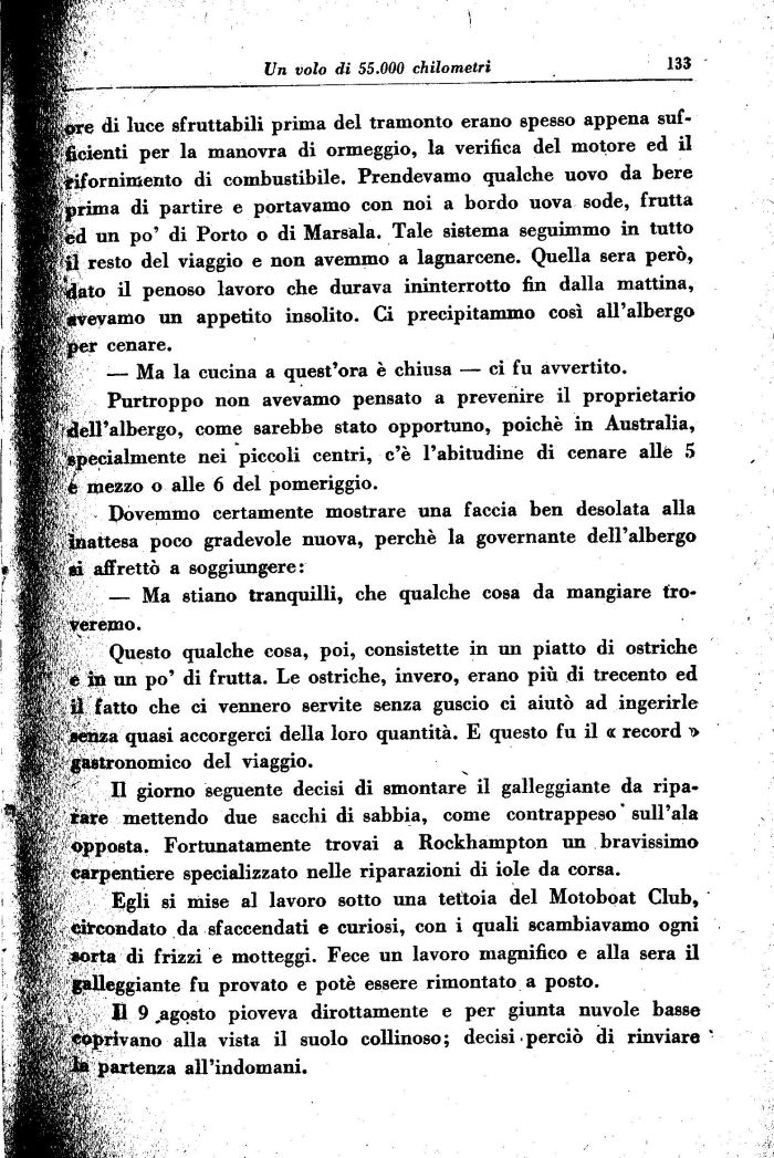 Il giorno seguente decisi di smontare il galleggiante da ripa-1 tare mettendo due sacchi di sabbia, come contrappeso * sull'ala ^ Opposta. Fortunatamente trovai a Rockhampton un bravissimo carpentiere specializzato nelle riparazioni di iole da corsa. ! . Egli si mise al lavoro sotto una tettoia del Motoboat Club, circondato da sfaccendati e curiosi, con i quali scambiavamo ogni «orta di frizzi e motteggi. Fece un lavoro magnifico e alla sera il galleggiante fu provato e potè essere rimontato a posto.