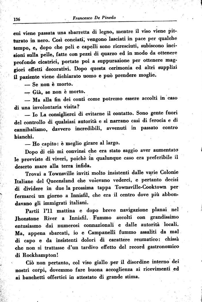 Partii l'il mattina e dopo breve navigazione planai nel Jhonstone River a Innisfil. Fummo accolti con grandissimo entusiasmo dai numerosi connazionali e dalle autorità locali. Ma, appena sbarcati, io e Campanelli fummo assaliti da mal di capo e da insistenti dolori di carattere reumatico: chissà che non si trattasse d'un tardivo effetto del record gastronomico di Rockhampton!