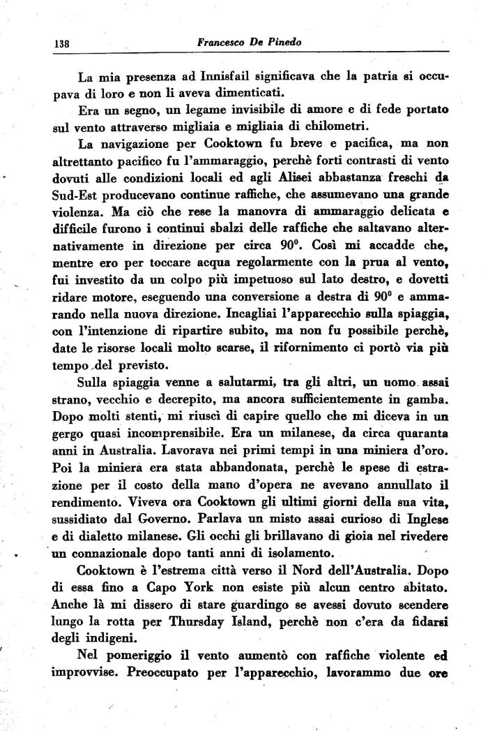La navigazione per Cooktown fu breve e pacifica, ma non altrettanto pacifico fu l'ammaraggio, perchè forti contrasti di vento dovuti alle condizioni locali ed agli Alisei abbastanza freschi da Sud-Est producevano continue raffiche, che assumevano una grande violenza. Ma ciò che rese la manovra di ammaraggio delicata e difficile furono i continui sbalzi delle raffiche che saltavano alternativamente in direzione per circa 90°. Così mi accadde che, mentre ero per toccare acqua regolarmente con la prua al vento, fui investito da un colpo più impetuoso sul lato destro, e dovetti ridare motore, eseguendo una conversione a destra di 90° e ammarando nella nuova direzione. Incagliai l'apparecchio sulla spiaggia, con l'intenzione di ripartire subito, ma non fu possibile perchè, date le risorse locali molto scarse, il rifornimento ci portò via più tempo,del previsto.