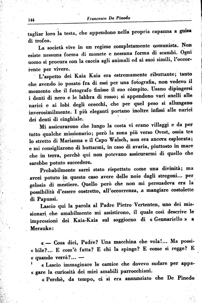 Lascio qui la parola al Padre Pietro Vertenten, uno dei missionari che amabilmente mi assistirono, il quale così descrive le impressioni dei Kaia-Kaia sul soggiorno di « Gennariello » a Merauke :