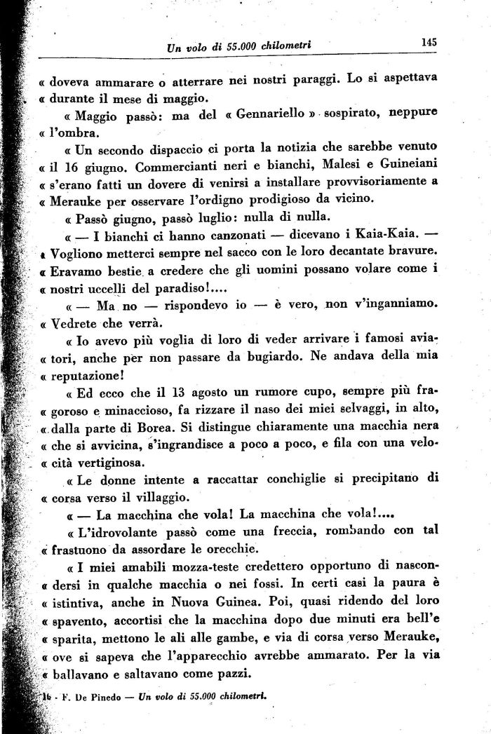 « Un secondo dispaccio ci porta la notizia che sarebbe venuto « il 16 giugno. Commercianti neri e bianchi, Malesi e Guineiani « s'erano fatti un dovere di venirsi a installare provvisoriamente a ́ « Merauke per osservare l'ordigno prodigioso da vicino, a Pasṣ giugno, pasṣ luglio: nulla di nulla. « — I bianchi ci hanno canzonati — dicevano i Kaia-Kaia. — t Vogliono metterci sempre nel sacco con le loro decantate bravure. « Eravamo bestie, a credere che gli uomini possano volare come i « nostri uccelli del paradiso!....