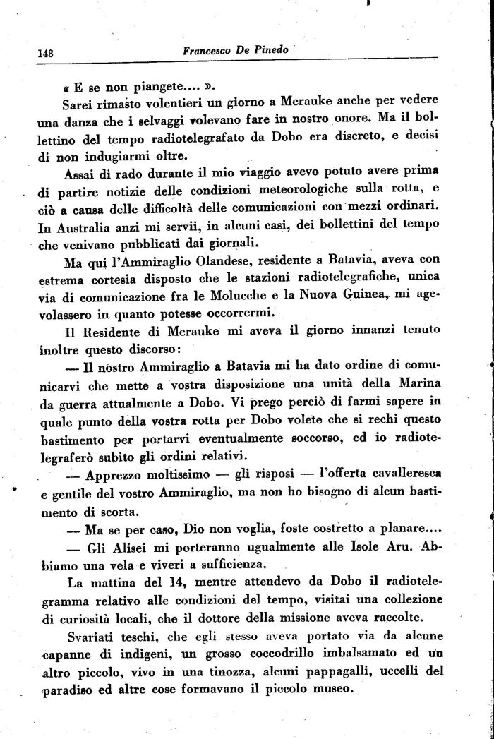 Ma qui l'Ammiraglio Olandese, residente a Batavia, aveva con estrema cortesia disposto che le stazioni radiotelegrafiche, unica via di comunicazione fra le Molucche e la Nuova Guinea, mi agevolassero in quanto potesse occorrermi.