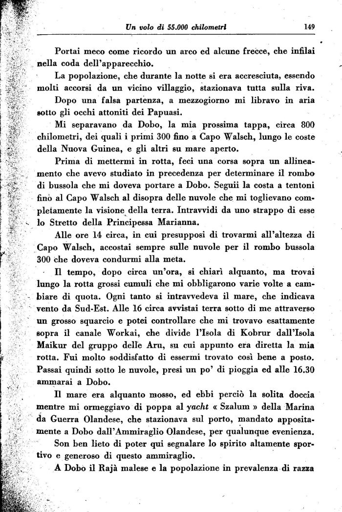 Il tempo, dopo circa un'ora, si chiarì alquanto, ma trovai lungo la rotta grossi cumuli che mi obbligarono varie volte a cambiare di quota. Ogni tanto si iiitrawedeva il mare, che indicava vento da Sud-Est. Alle 16 circa avvistai terra sotto di me attraverso un grosso squarcio e potei controllare che mi trovavo esattamente sopra il canale Workai, che divide l'Isola di Kobrur dall'Isola Maikur del gruppo delle Aru, su cui appunto era diretta la mia rotta. Fui molto soddisfatto di essermi trovato così bene a posto. Passai quindi sotto le nuvole, presi un po' di pioggia ed alle 16.30 ammarai a Dobo.