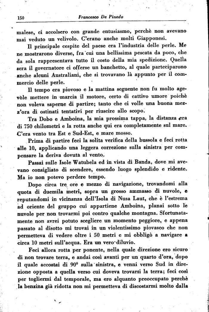 Dopo circa tre. ore e mezzo di navigazione, trovandomi alla quota di duemila metri, sopra un grosso ammasso di nuvole, e reputandomi in vicinanza dell'Isola di Nusa Laut, che è l'estrema ad oriente del gruppo cui appartiene Amboina, planai sotto le nuvole per non trovarmi poi contro qualche montagna. Sfortunatamente non avrei potuto scegliere un momento peggiore, e appena passato al disotto mi trovai in un violentissimo piovasco che non permetteva di vedere oltre i 50 metri e mi obbligò a navigare a circa 10 metri sull'acqua. Era un vero'diluvio.