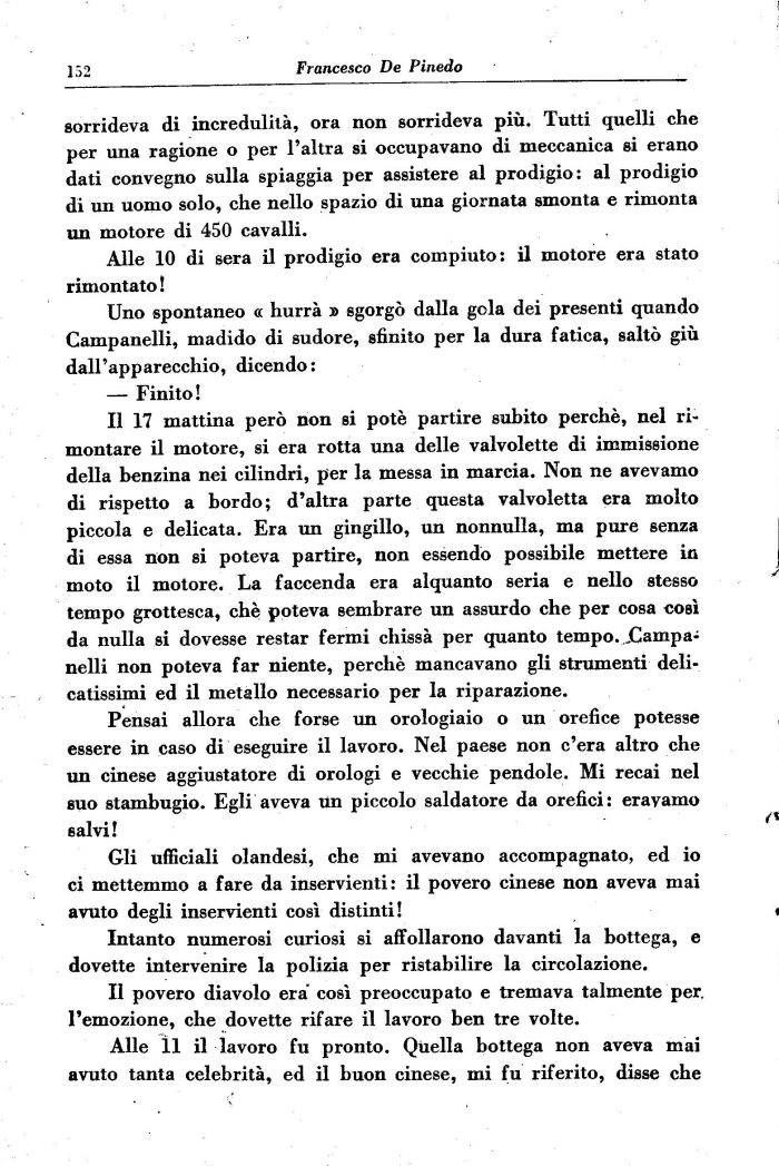 Il 17 mattina però non si potè partire subito perchè, nel rimontare il motore, si era rotta una delle valvolette di immissione della benzina nei cilindri, per la messa in marcia. Non ne avevamo di rispetto a bordo; d'altra parte questa valvoletta era molto piccola e delicata. Era un gingillo, un nonnulla, ma pure senza di essa non si poteva partire, non essendo possibile mettere in moto il motore. La faccenda era alquanto seria e nello stesso tempo grottesca, chè poteva sembrare un assurdo che per cosa così da nulla si dovesse restar fermi chissà per quanto tempo. .Campanelli non poteva far niente, perchè mancavano gli strumenti delicatissimi ed il metallo necessario per la riparazione.