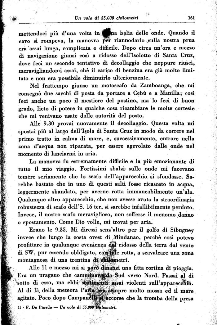 La manovra fu estremamente difficile e la più emozionante di tutto il mio viaggio. Fortissimi sbalzi- sulle onde mi facevano temere seriamente che lo scafo dell'apparecchio si sfondasse. Sarebbe bastato che in uno di questi salti fosse ricascato in acqua, leggermente sbandato, per averne rotta immancabilmente un'ala. Qualunque altro apparecchio, che non avesse avuto la straordinaria robustezza di scafo dell'S. 16 ter, si sarebbe infallibilmente perduto. Invece, il nostro scafo meraviglioso, non sofferse il menomo danno o spostamento. Come Dio volle, mi trovai per aria.