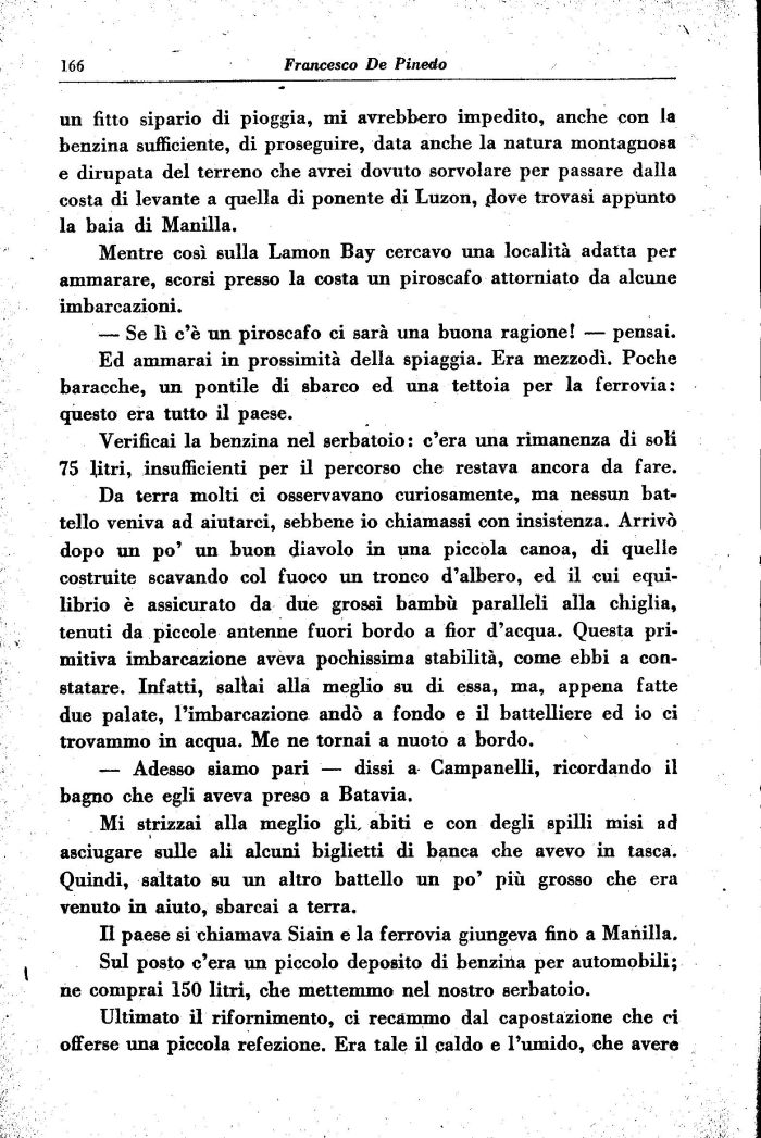 un fitto sipario di pioggia, mi avrebbero impedito, anche con la benzina sufficiente, di proseguire, data anche la natura montagnosa e dirupata del terreno che avrei dovuto sorvolare per passare dalla costa di levante a quella di ponente di Luzon, dove trovasi appunto la baia di Manilla.