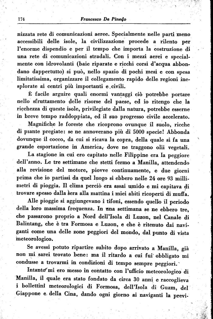 La stagione in cui ero capitato nelle Filippine era la peggiore dell'anno. Le tre settimane che stetti fermo a Manilla, attendendo alla revisione del motore, piovve continuamente, e due giorni prima che io partissi da quel luogo si ebbero nelle 24 ore 93 millimetri di pioggia. Il clima perciò era assai umido e mi capitava di trovare spesso dalla àera alla mattina i miei abiti ricoperti di muffa.