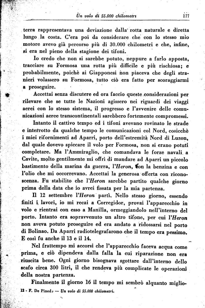 Intanto il cattivo tempo ed i tifoni avevano rovinato le strade e interrotto da qualche tempo le comunicazioni col Nord, cosicché i miei rifornimenti ad Aparri, porto dell'estremità Nord di Luzon, dal quale dovevo spiccare il volo per Formosa, non si erano potuti completare. Ma l'Ammiraglio, che comandava le forze navali a Cavite, mplto gentilmente mi offrì di mandare ad Aparri un piccolo bastimento della marina da guerra, VHeron, Con la benzina e con l'olio che mi occorrevano. Accettai la generosa offerta con riconoscenza. Fu stabilito che VHeron sarebbe partito qualche giorno prima della data che io avrei fissata per la mia partenza.