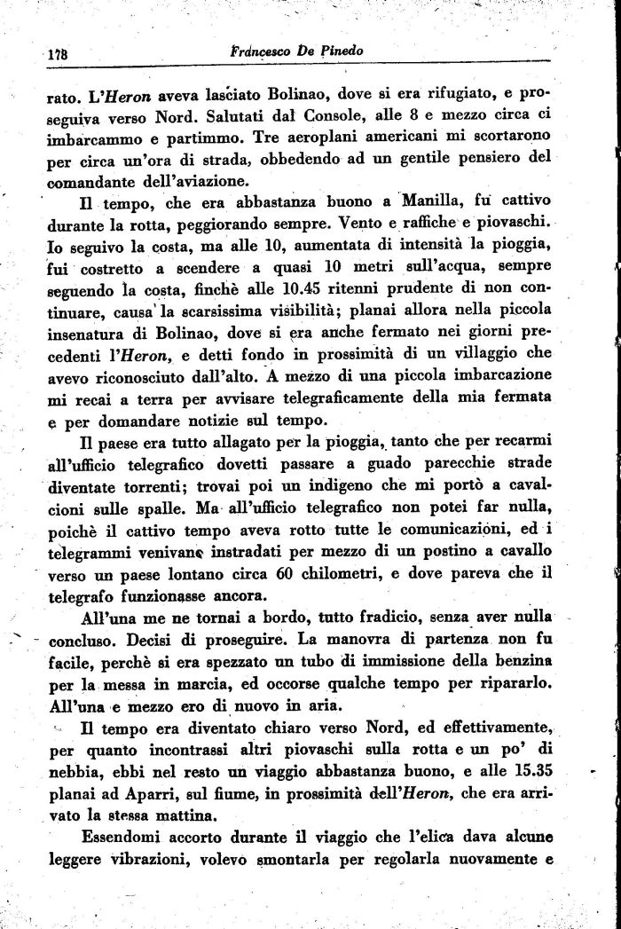Il tempo era diventato chiaro verso Nord, ed effettivamente, per quanto incontrassi altri piovaschi sulla rotta e un po' di nebbia, ebbi nel resto un viaggio abbastanza buono, e alle 15.35 planai ad Aparri, sul fiume, in prossimità dell'Aero», che era arrivato la stessa mattina.