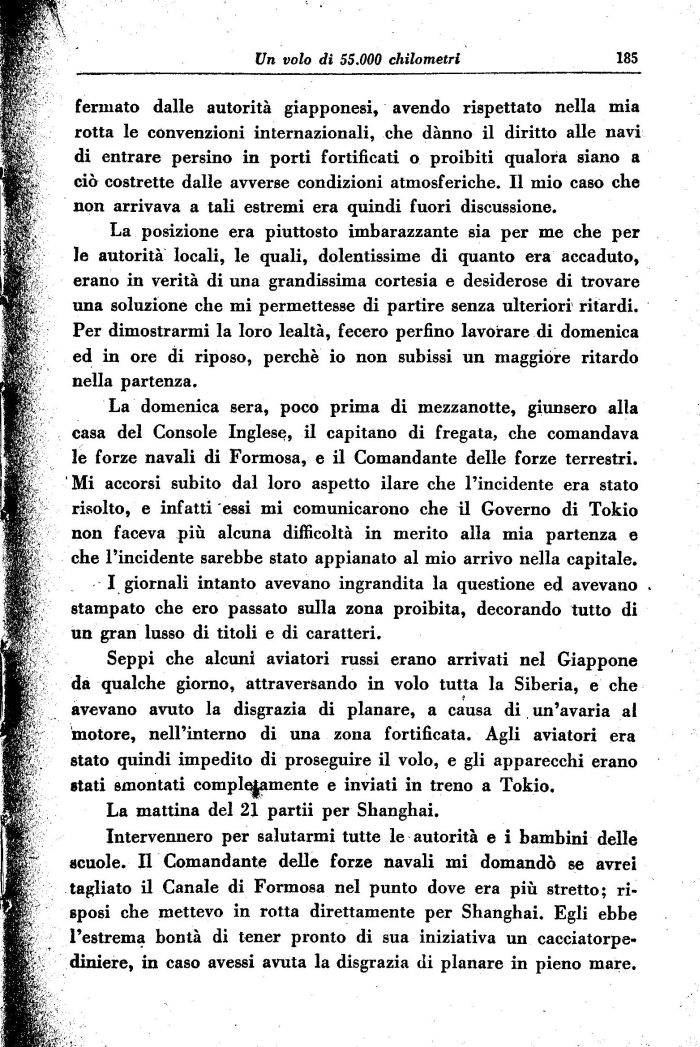 Intervennero per salutarmi tutte le autorità e i bambini delle scuole. Il Comandante delle forze navali mi domandò se avrei tagliato il Canale di Formosa nel punto dove era più stretto; risposi che mettevo in rotta direttamente per Shanghai. Egli ebbe l'estrema bontà di tener pronto di sua iniziativa un cacciatorpediniere, in caso avessi avuta la disgrazia di planare in pieno mare.