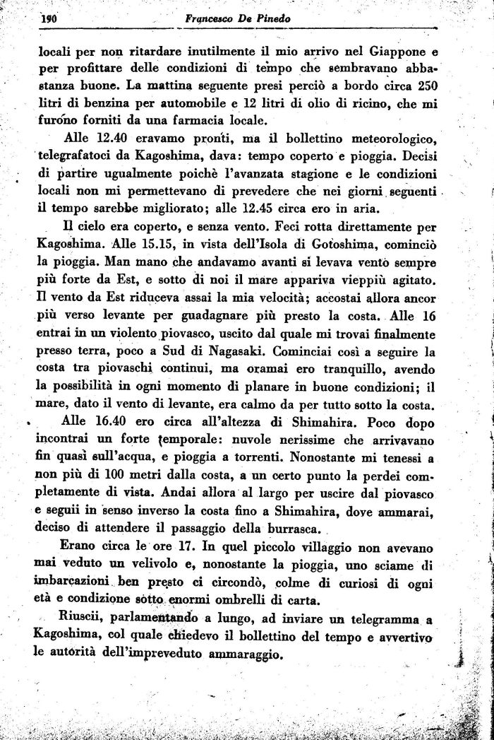 H cielo era coperto, e senza vento. Feci rotta direttamente per Kagoshima. Alle 15.15, in vista dell'Isola di Gotoshima, cominciò la pioggia. Man mano che andavamo avanti si levava ventò sempre più forte da Est, e sotto di noi il mare appariva vieppiù agitato. Il vento da Est riduceva assai la mia velocità; accostai allora ancor più verso levante per guadagnare più presto la costa. Alle 16 entrai in un violento piovasco, uscito dal quale mi trovai finalmente presso terra, poco a Sud di Nagasaki. Cominciai così a seguire la costa tra piovaschi continui, ma oramai ero tranquillo, avendo la possibilità in ogni momento di planare in buone condizioni; il mare, dato il vento di levante, era calmo da per tutto sotto la costa.