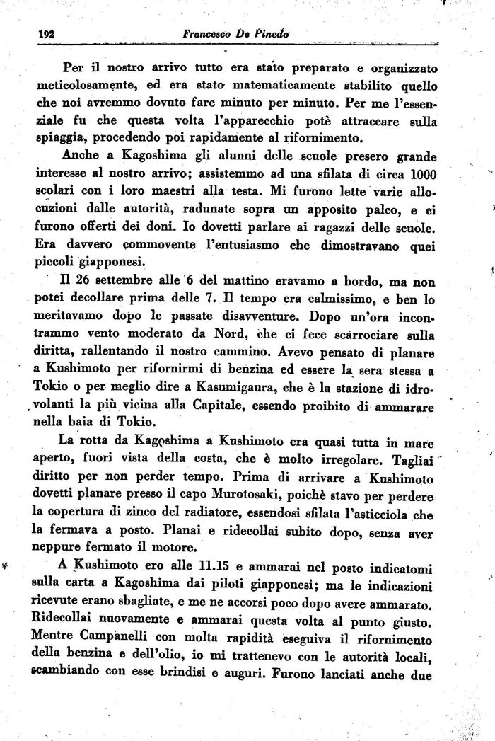 A Kushimoto ero alle 11.15 e ammarai nel posto indicatomi sulla carta a Kagoshima dai piloti giapponesi; ma le indicazioni ricevute erano sbagliate, e me ne accorsi poco dopo avere ammarato. Ridecollai nuovamente e ammarai questa volta al punto giusto. Mentre Campanelli con molta rapidità eseguiva il rifornimento della benzina e dell'olio, io mi trattenevo con le autorità locali, scambiando con esse brindisi e auguri. Furono lanciati anche due