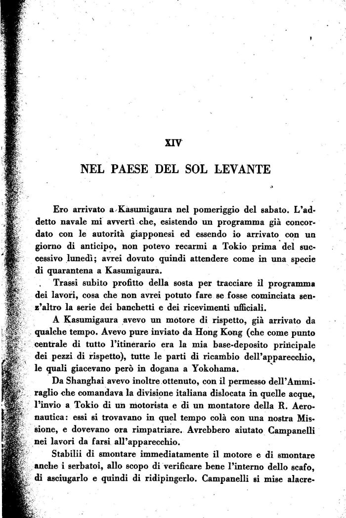 Da Shanghai avevo inoltre ottenuto, con il permesso dell'Ammiraglio che comandava la divisione italiana dislocata in quelle acque, l'invio a Tokio di un motorista e di un montatore della R. Aeronautica: essi si trovavano in quel tempo colà con una nostra Missione, e dovevano ora rimpatriare. Avrebbero aiutato Campanelli nei lavori da farsi all'apparecchio.