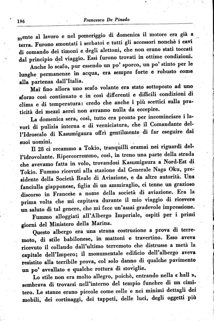 Il 28 ci recammo a Tokio, tranquilli oramai nei riguardi dell'idrovolante. Ripercorremmo, così, in treno una parte della strada che avevamo fatta in volo, trovandosi Kasumigaura a Nord-Est di Tokio. Fummo ricevuti alla stazione dal Generale Naga Oku, presidente della Società Reale di Aviazione, e da altre autorità. Una fanciulla giapponese, figlia di un ammiraglio, ci tenne un grazioso discorso in Francese a nome della società di aviazione. Era la prima volta che mi capitava durante il mio viaggio di ricevere un saluto di tal genere, che mi fece un'assai gradevole impressione.
