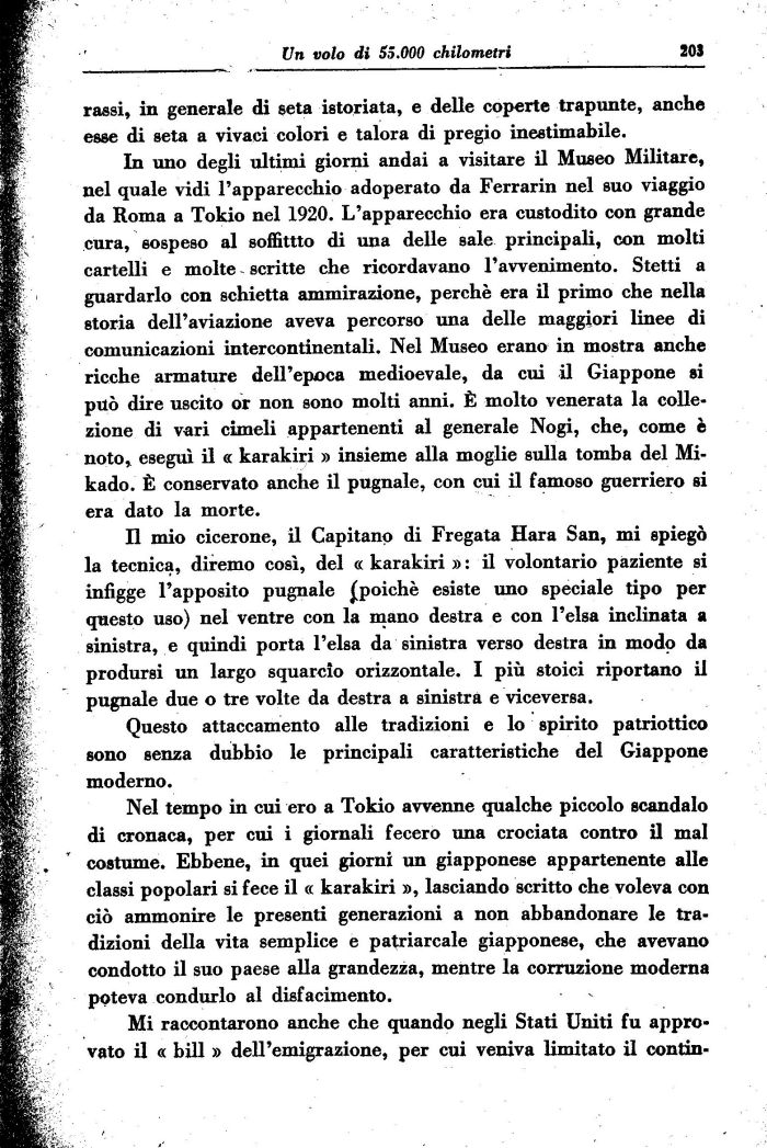 In uno degli ultimi giorni andai a visitare il Museo Militare, nel quale vidi l'apparecchio adoperato da Ferrarin nel suo viaggio da Roma a Tokio nel 1920. L'apparecchio era custodito con grande cura, sospeso al soffittto di una delle sale principali, con molti cartelli e molte scritte che ricordavano l'avvenimento. Stetti a guardarlo con schietta ammirazione, perchè era il primo che nella storia dell'aviazione aveva percorso una delle maggiori linee di comunicazioni intercontinentali. Nel Museo erano in mostra anche ricche armature dell'epoca medioevale, da cui il Giappone si può dire uscito or non sono molti anni. È molto venerata la collezione di vari cimeli appartenenti al generale Nogi, che, come è noto, esegui il « karakiri » insieme alla moglie sulla tomba del Mi-kado. È conservato anche il pugnale, con cui il famoso guerriero si era dato la morte.