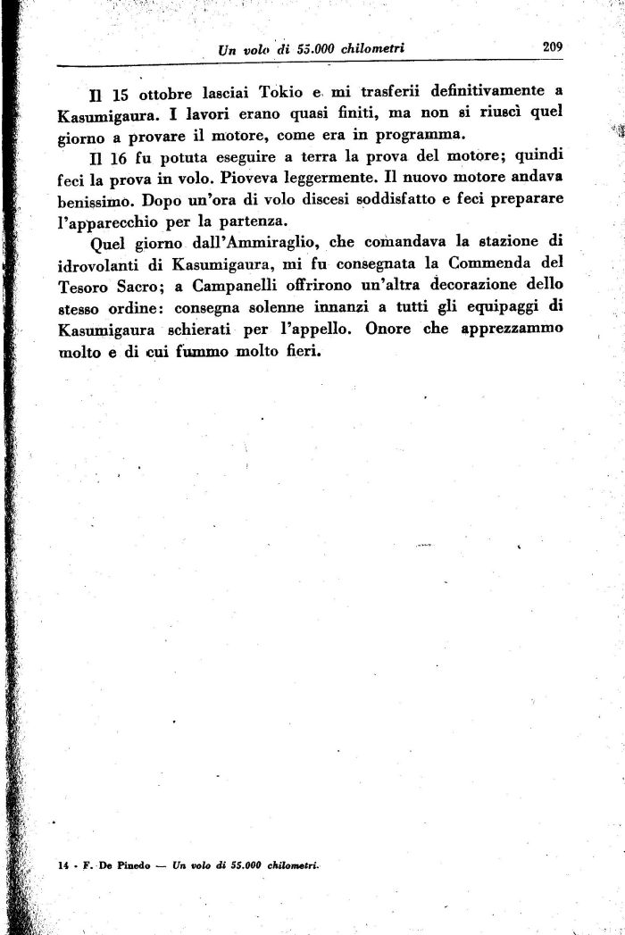 Quel giorno dall'Ammiraglio, che comandava la stazione di idrovolanti di Kasumigaura, mi fu consegnata la Commenda del Tesoro Sacro; a Campanelli offrirono un'altra decorazione dello stesso ordine: consegna solenne innanzi a tutti gli equipaggi di Kasumigaura schierati per l'appello. Onore che apprezzammo molto e di cui fummo molto fieri.