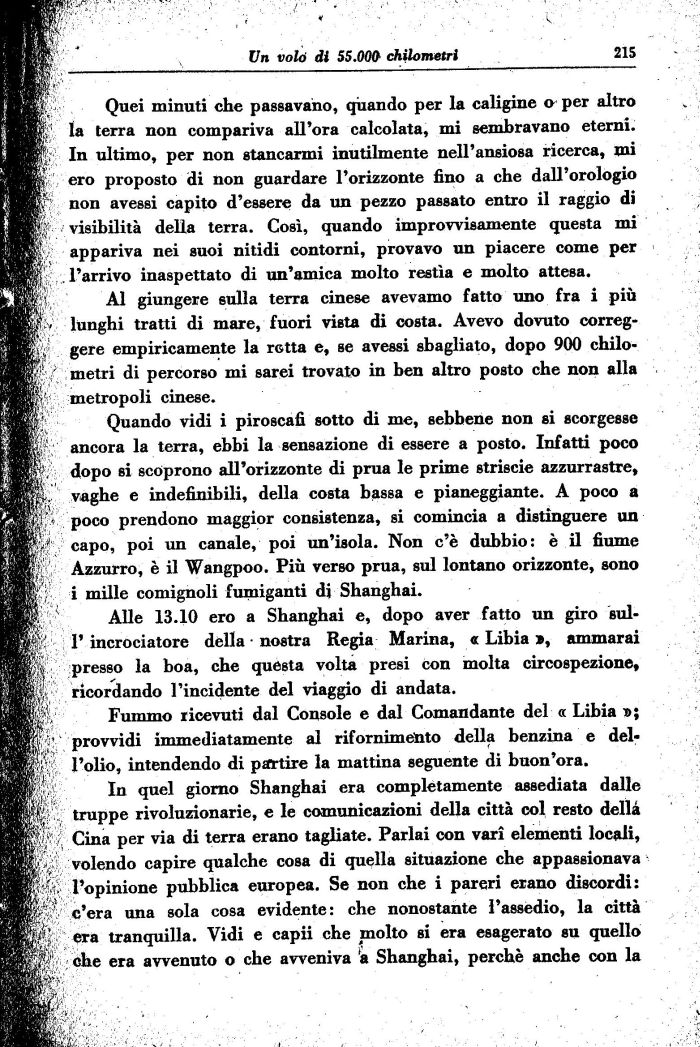 Alle 13.10 ero a Shanghai e, dopo aver fatto un giro sul-l'incrociatore della nostra Regia Marina, « Libia x, ammarai presso la boa, che questa volta presi Con molta circospezione, ricordando l'incidente del viaggio di andata.