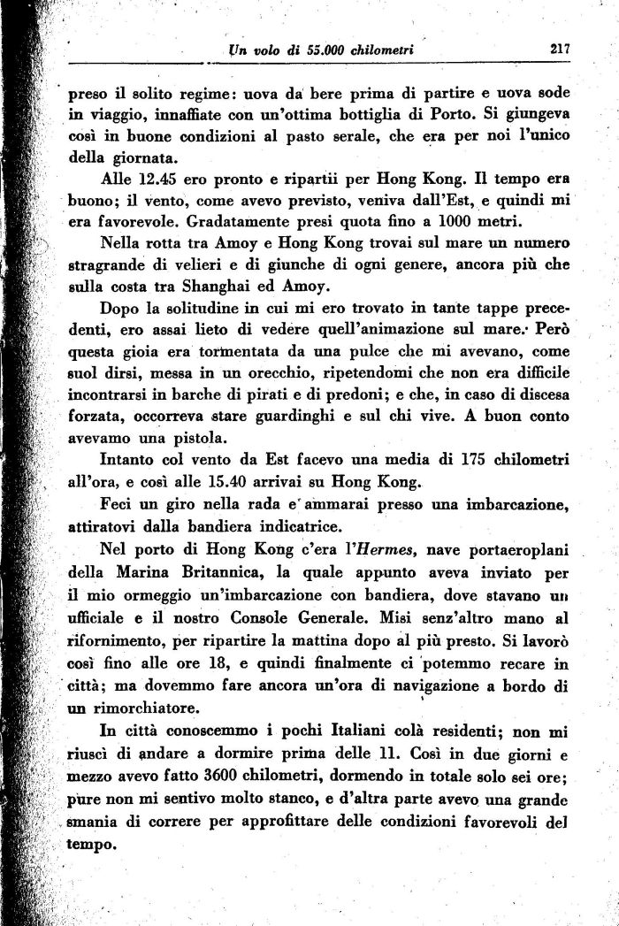 Nel porto di Hong Kong c'era l'Hermes, nave portaeroplani della Marina Britannica, la quale appunto aveva inviato per il mio ormeggio un'imbarcazione con bandiera, dove stavano un ufficiale e il nostro Console Generale. Misi senz'altro mano al rifornimento, per ripartire la mattina dopo al più presto. Si lavorò così fino alle ore 18, e quindi finalmente ci potemmo recare in città; ma dovemmo fare ancora un'ora di navigazione a bordo di un rimorchiatore.