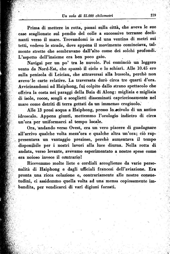 Ricevemmo molte liete e cordiali accoglienze da varie personalità di Haiphong e dagli ufficiali francesi dell'aviazione. Era pronta una ricca colazione e, contrariamente ajle nostre consuetudini, ci assidemmo quella volta ad una mensa copiosamente imbandita, per vendicarci di vari digiuni forzati.