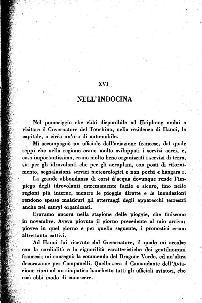 Ad Hanoi fui ricevuto dal Governatore, il quale mi accolse con la cordialità e la signorilità caratteristiche dei gentiluomini francesi; mi consegnò la commenda del Dragone Verde, ed un'altra decorazione per Campanelli. Quella sera il Comandante dell'Aviazione riunì ad un simpatico banchetto tutti gli ufficiali aviatori, che così ebbi modo di conoscere.