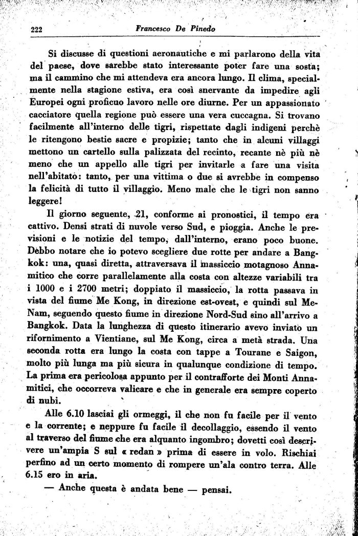 Il giorno seguente, -21, conforme ai pronostici, il tempo era cattivo. Densi strati di nuvole verso Sud, e pioggia. Anche le previsioni e le notizie del tempo, dall'interno, erano poco buone. Dèbbo notare che io potevo scegliere due rotte per andare a Bangkok: una, quasi diretta, attraversava il massiccio motagnoso Anna-mitico che corre parallelamente alla costa con altezze variabili tra i 1000 e i 2700 metri; doppiato il massiccio, la rotta passava in vista del fiume Me Kong, in direzione est-ovest, e quindi sul Me-Nam, seguendo questo fiume in direzione Nord-Sud sino all'arrivo a Bangkok. Data la lunghezza di questo itinerario avevo inviato un rifornimento a Vientiane, sul Me Kong, circa a metà strada. Una seconda rotta era lungo la costa con tappe a Tourane e Saigon, molto più lunga ma più sicura in qualunque condizione di tempo. La prima era pericolosa appunto perii contrafforte dei Monti Anna-mitici, che occorreva valicare e che in generale era sempre coperto di nubi.
