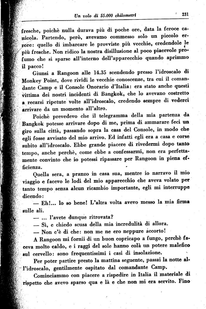 Giunsi a Rangoon alle 14.35 scendendo presso l'idroscalo di Monkey Point, dove rividi le vecchie conoscenze, tra cui il comandante Camp e il Console Onorario d'Italia: era stato anche questi Vittima dei nostri incidenti di Bangkok, che lo avevano costretto a recarsi ripetute Volte all'idroscalo, credendo sempre di vederci arrivare da un momento all'altro.