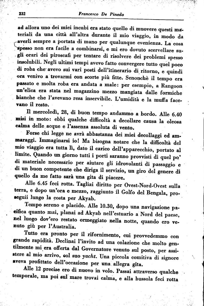 Forse chi legge ne avrà abbastanza dei miei decollaggi ed ammaraggi. Immaginarsi io! Ma bisogna notare che la difficoltà del mio viaggio era tutta lì, dato il carico dell'apparecchio, portato al limite. Quando un giorno tutti i porti saranno provvisti di quel po' di materiale necessàrio per aiutare gli idrovolanti di passaggio e di un buon competente che diriga il servizio, un giro del genere di quello da me fatto sarà una gita di piacere.
