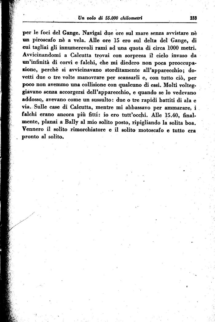 per le foci del Gange. Navigai due ore sul mare senza avvistare nč un piroscafo nč a vela. Alle ore 15 ero sul delta del Gange, di cui tagliai gli innumerevoli rami ad una quota di circa 1000 metri. Avvicinandomi a Calcutta trovai con sorpresa il cielo invaso da un'infinitą di corvi e falchi, che mi diedero non poca preoccupazione, perchč si avvicinavano storditamente all'apparecchio; dovetti due o tre volte manovrare per scansarli e, con tutto ciņ, per poco non avemmo una collisione con qualcuno di essi. Molti volteggiavano senza accorgersi dell'apparecchio, e quando se lo vedevano addosso,, avevano come un sussulto: due o tre rapidi battiti di ala e via. Sulle case di Calcutta, mentre mi abbassavo per ammarare, i falchi erano ancora pił fitti: io ero tutt'occju. Alle 15.40, finalmente, planai a Bally al mio solito posto, ripigliando la solita boa. Vennero il solito rimorchiatore e il solito motoscafo e tutto era pronto al solito.
