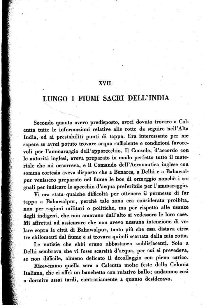 Secondo quanto avevo predisposto, avrei dovuto trovare a Calcutta tutte le informazioni relative alle rotte da seguire nell'Alta India, ed ai prestabiliti punti di tappa. Era interessante per me sapere se avrei potuto trovare acqua sufficiente e condizioni favorevoli per l'ammaraggio dell'apparecchio. Il Console, d'accordo con le autorità inglesi, aveva preparato in modo perfetto tutto il materiale che mi occorreva, e il Comando dell'Aeronautica inglese con somma cortesia aveva disposto che a Benares, a Delhi e a Bahawal-pur venissero preparate nel fiume le boe di ormeggio nonché i segnali per indicare lo specchio d'acqua preferibile per l'ammaraggio.