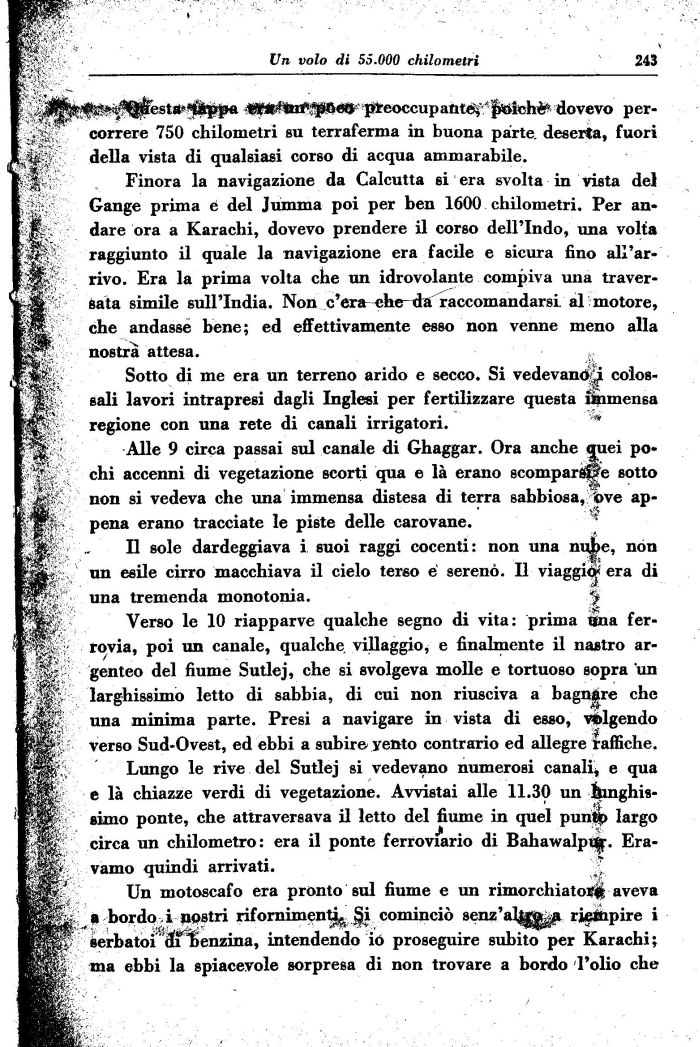 Finora la navigazione da Calcutta si era svolta in rista del Gange prima é del Jumma poi per ben 1600 chilometri. Per andare ora a Karachi, dovevo prendere il corso dell'Indo, una volta raggiunto il quale la navigazione era facile e sicura fino all'arrivo. Era la prima volta che un idrovolante compiva una traversata simile sull'India. Non o'era «he^ da raccomandarsi al inotore, che andasse bene; ed effettivamente esso non venne meno alla nostra attesa.