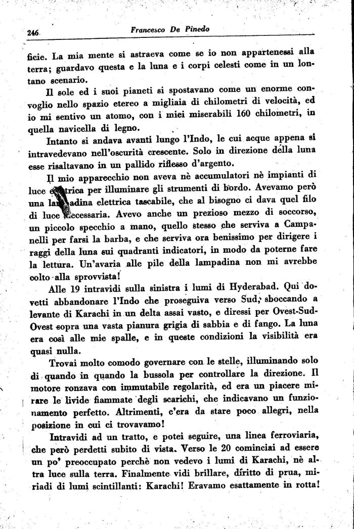 Intravidi ad un tratto, e potei seguire, una linea ferroviaria, che perņ perdetti subito di vista. Verso le 20 cominciai ad essere un po' preoccupato perchč non vedevo i lumi di Karachi, nč altra luce sulla terra. Finalmente vidi brillare, diritto di prua, miriadi di lumi scintillanti: Karachi! Eravamo esattamente in rotta!