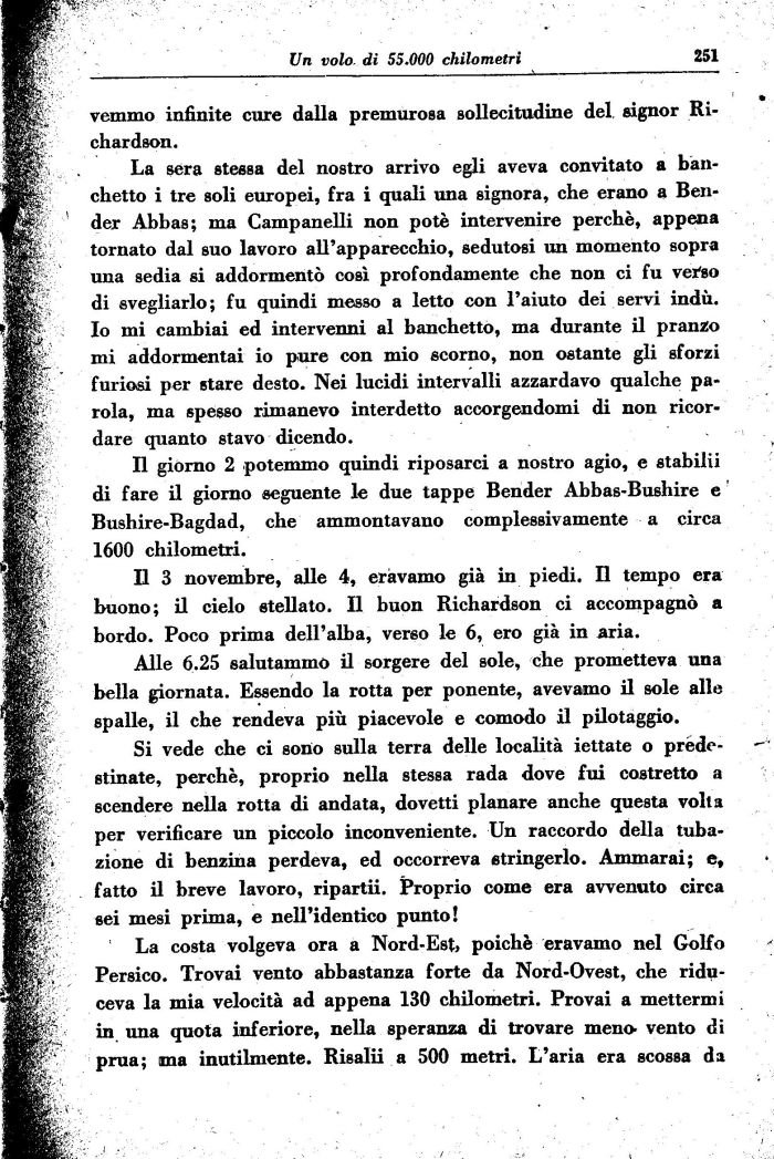 La costa volgeva ora a Nord-Est, poiché eravamo nel Golfo Persico. Trovai vento abbastanza forte da Nord-Ovest, che riduceva la mia velocità ad appena 130 chilometri. Provai a mettermi in una quota inferiore, nella speranza di trovare meno- vento di prua; ma inutilmente. Risalii a 500 metri. L'aria era scossa da
