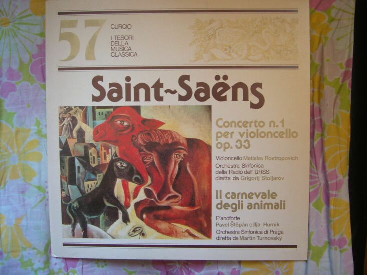 Disco in vinile a 33 giri LP della collezione Curcio denominata "I tesori della musica classica". Disco numero 57: Saint-Saens, Concerto n. 1 per violoncello op. 33 + "Il carnevale degli animali"