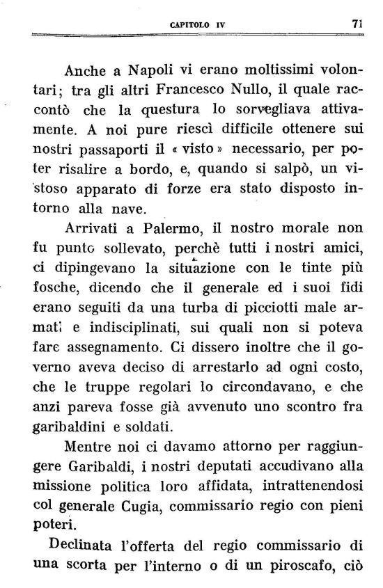 Anche a Napoli vi erano moltissimi volontari; tra gli altri Francesco Nullo, il quale raccontò che la questura lo sorvegliava attivamente. A noi pure riesci difficile ottenere sui nostri passaporti il « visto » necessario, per poter risalire a bordo, e, quando si salpò, un vistoso apparato di forze era stato disposto intorno alla nave.