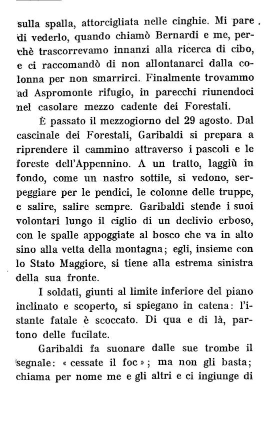 sulla spalla, attorcigliata nelle cinghie. Mi pare tli vederlo, quando chiamò Bernardi e me, perchè trascorrevamo innanzi alla ricerca di cibo, e ci raccomandò di non allontanarci dalla colonna per non smarrirci. Finalmente trovammo ad Aspromonte rifugio, in parecchi riunendoci nel casolare mezzo cadente dei Forestali.