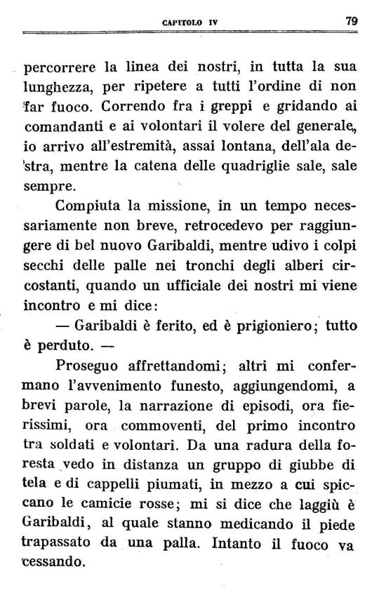 Compiuta la missione, in un tempo necessariamente non breve, retrocedevo per raggiungere di bel nuovo Garibaldi, mentre udivo i colpi secchi delle palle nei tronchi degli alberi circostanti, quando un ufficiale dei nostri mi viene incontro e mi dice :