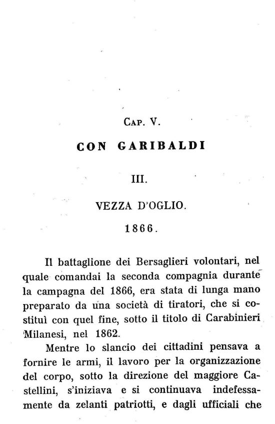 II battaglione dei Bersaglieri volontari, nel quale comandai la seconda compagnia durante la campagna del 1866, era stata di lunga mano preparato da una società di tiratori, che si costituì con quel fine, sotto il titolo di Carabinieri Milanesi, nel 1862.