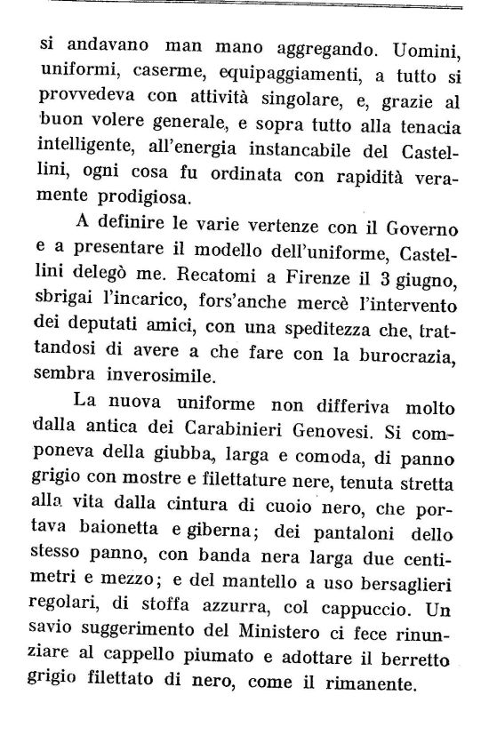 La nuova uniforme non differiva molto dalla antica dei Carabinieri Genovesi. Si componeva della giubba, larga e comoda, di panno grigio con mostre e filettature nere, tenuta stretta alla vita dalla cintura di cuoio nero, che portava baionetta e giberna; dei pantaloni dello stesso panno, con banda nera larga due centimetri e mezzo; e del mantello a uso bersaglieri regolari, di stoffa azzurra, col cappuccio. Un savio suggerimento del Ministero ci fece rinunziare al cappello piumato e adottare il berretto grigio filettato di nero, come il rimanente.